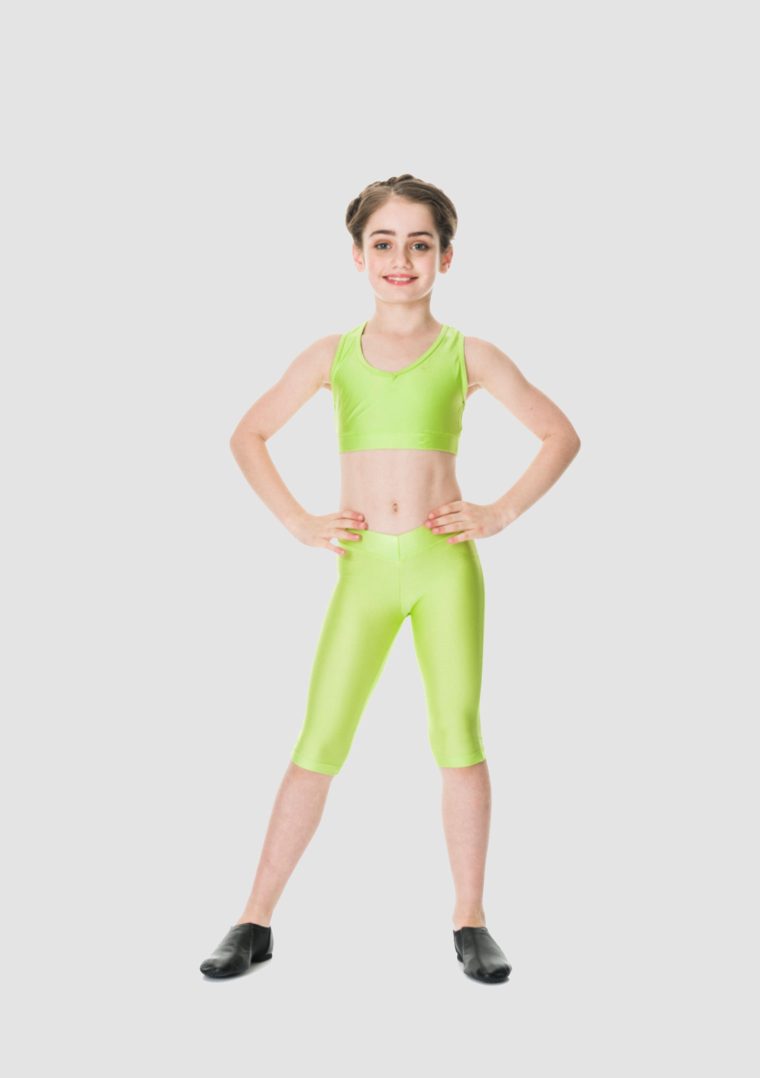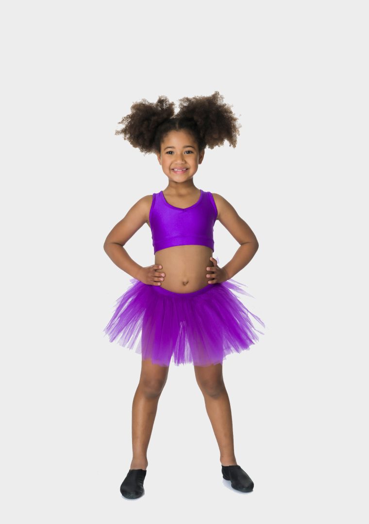 The T-Back Crop Top is a fun and comfy dance crop top in nylon/Lycra with a pinched v-neck and t-back, great for class or costume.
