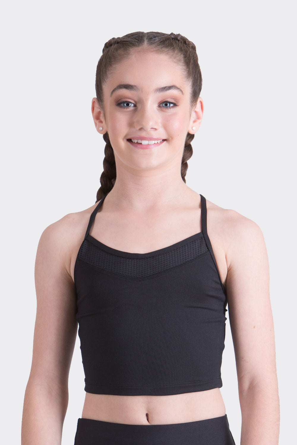 The Kara Crop Top is a mid-length dance crop top in a supportive split back style, with a y-shape to shoulder straps and triangle back cutout.
